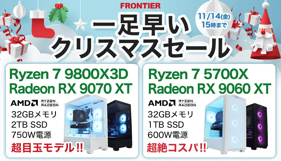 | おすすめモデル | ・GALLERIA XPC7A-R57-GD ・GALLERIA XPC7A-R57-WL ・GALLERIA FPR7A-R57-B ・GALLERIA FPR7A-R57-W ・FRGHLMB650/WS1114/NTK(メモリのカスタイマイズ) ・【H26series】 Ryzen7 9700x・RTX5070Ti ☆G-GEAR GE7J-M253BH/SP1 ・Lenovo Legion Tower 5 30IAS10(11/15追加、メモリ、ストレージ、グラボのカスタマイズでお得度◎) ・【P30series】 Ryzen7 9800x3D・RX9070XT ☆【4000D 性能重視モデル】 Ryzen7 9800x3D・RX9070XT ☆【ピラーレスseries】 Ryzen7 9800x3D・RX9070XT ・FRGHLMB650/WS1113/NTK(メモリのカスタイマイズ) ☆G TUNE FG-A7ATX(VRAMが必要な用途に!) ・FRGHLMB650/WS1111/NTK(11/17追記、メモリのカスタマイズ、空冷が良い人はこちら) |