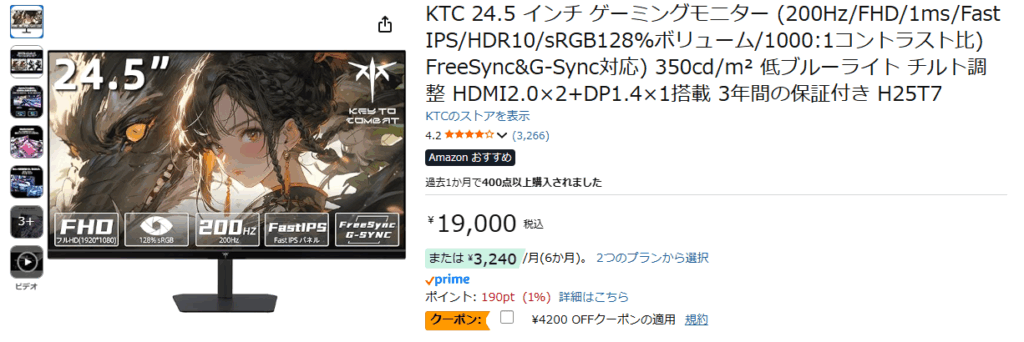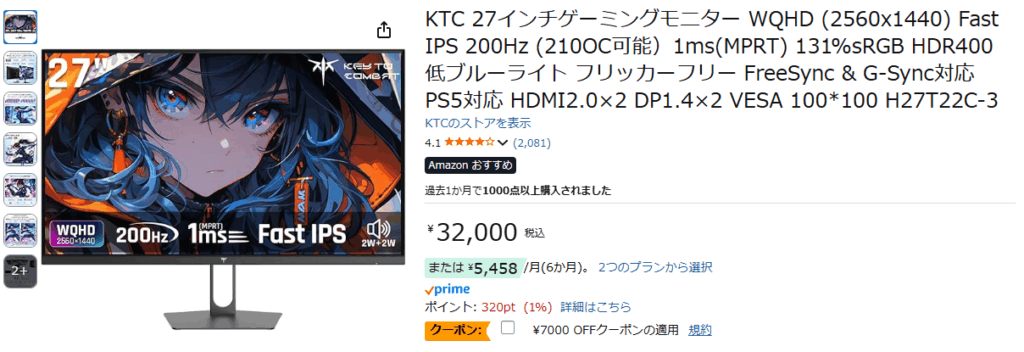 上記2つの画像は、2025年10月時点でのゲーミングモニターで人気のあるKTCのフルHDとWQHDの製品です。